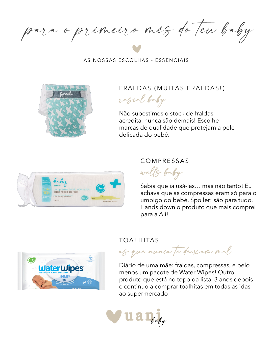 2. Compressas: e eu que achei que as compressas eram só para o umbigo? Spoiler: servem para TUDO. As compressas Wells Baby foram a minha arma secreta para a logística diária. Hands down, o produto mais usado cá em casa.