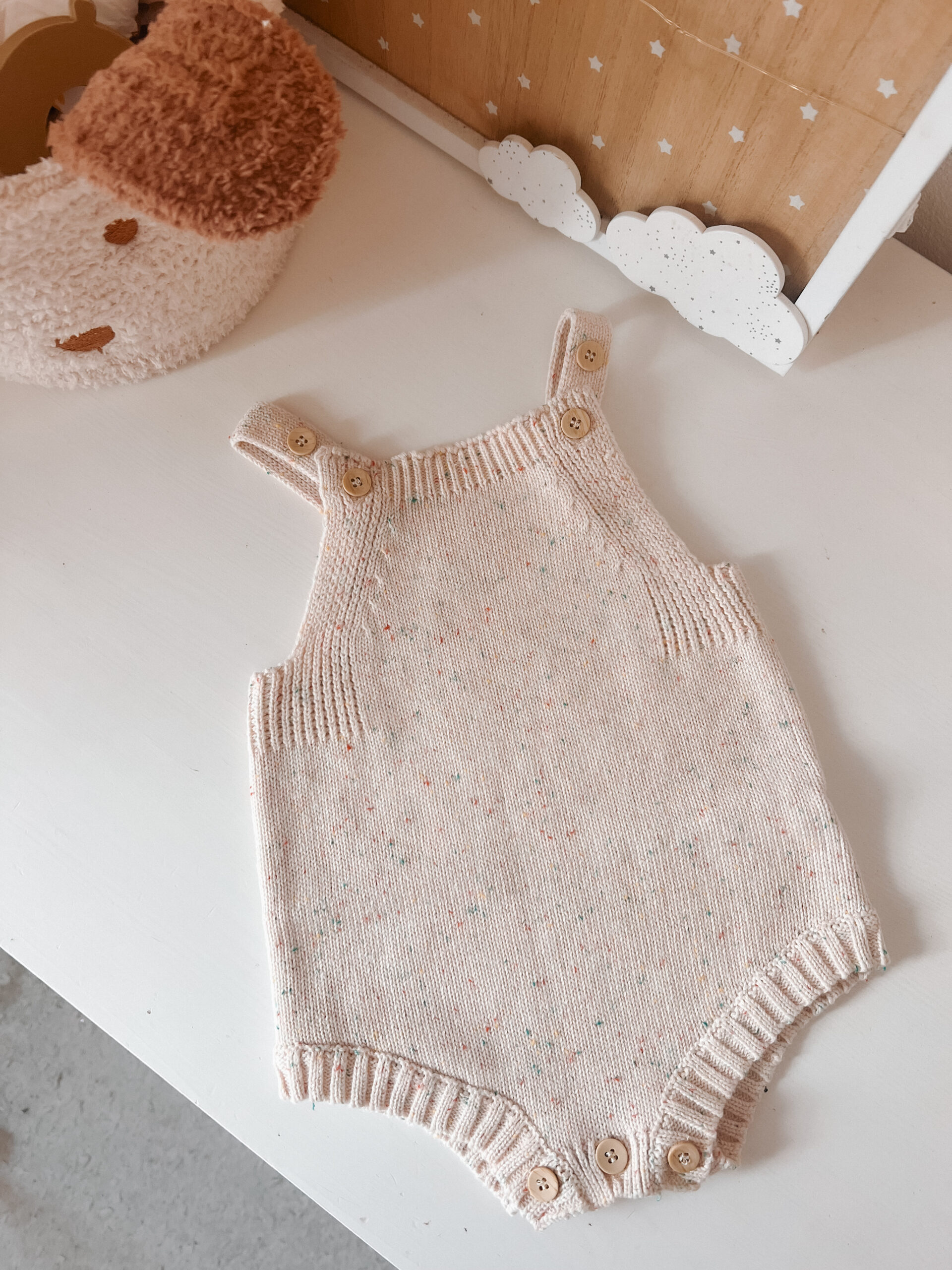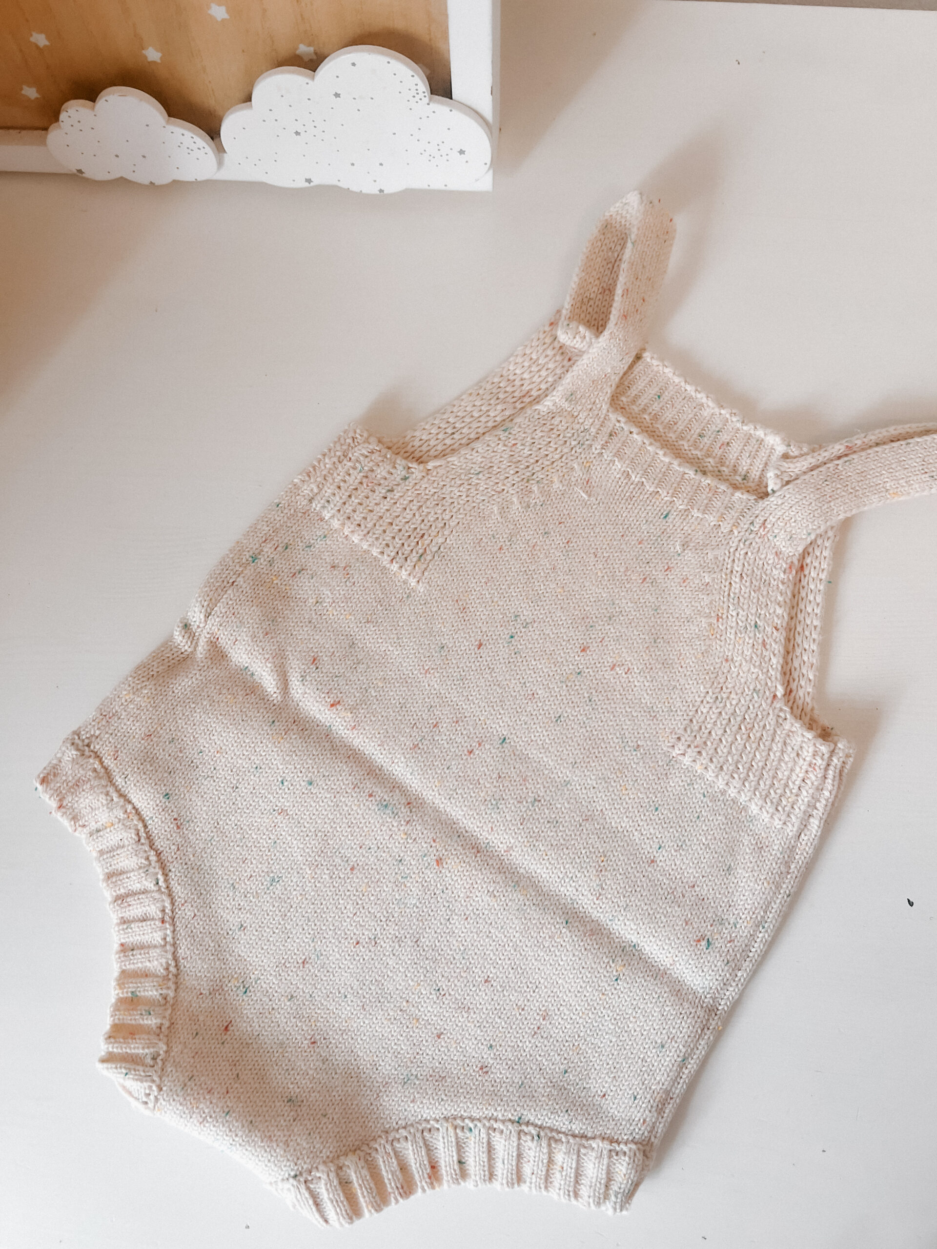 Com um design minimalista em tom bege e pequenos detalhes coloridos estilo “sprinkles”, este modelo acrescenta um toque subtil e encantador, mantendo a elegância. As alças com botões facilitam o vestir e o fecho inferior torna a muda da fralda prática no dia a dia.